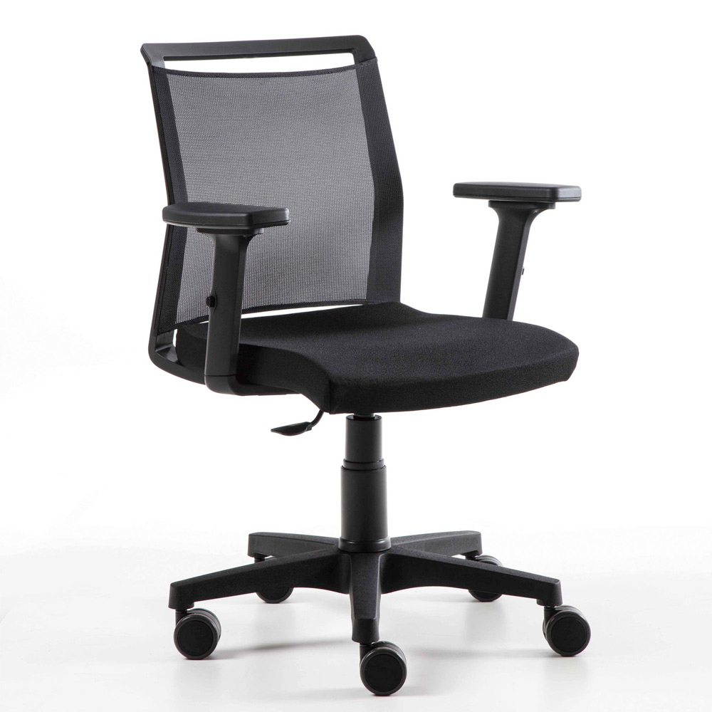Kontorsfåtölj i teknisk tyg och svart nät med gaslyft.