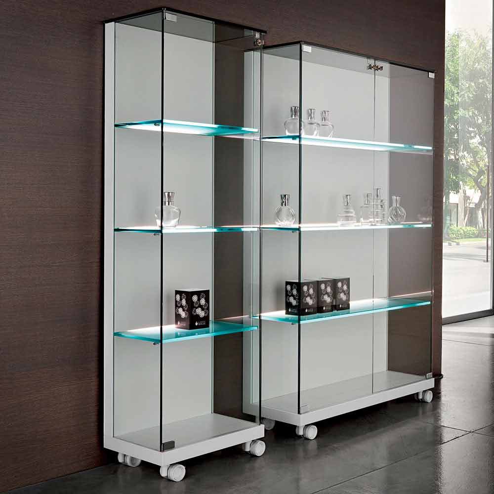 Tvådörrars skåp med hjul för att underlätta rörelsen är gjord av genomskinligt härdat glas och en struktur i matt vitlackerat trä.